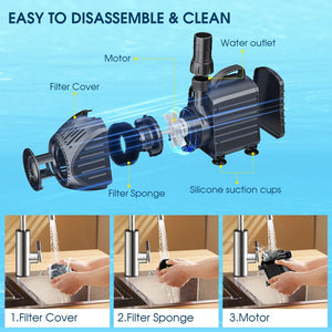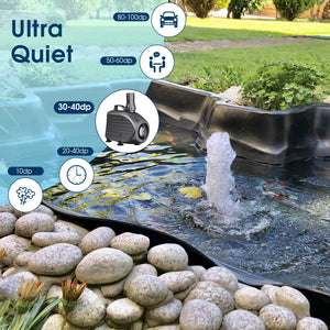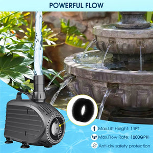 1200GPH high-flow submersible pump with ultra-quiet operation (30-40dB) and dry burning protection. Features adjustable flow valve, 11ft lift height, and tool-free disassembly for easy maintenance. Ideal for ponds, fountains, waterfalls, hydroponics, and aquariums. IPX8 waterproof, energy-efficient 80W motor.