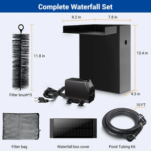 Complete outdoor pond waterfall kit with 304 stainless steel spillway box (7.8"W x 13.4"H), 660GPH pump, solar-powered blue LED light, and easy-install accessories. Filters included for low maintenance. Perfect for ponds 500-2000 gallons. Enhance garden water features with steady flow & nighttime ambiance.