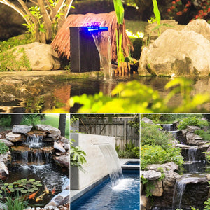 Includes Large 7.8" W 13.4" H Capacity Stainless Waterfall Box, 660GPH Water Pump, LED Lights for Garden Outdoor Pond 500-2000 Gallons N4213