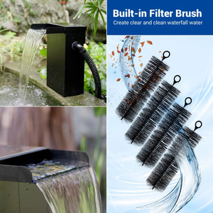 Complete outdoor pond waterfall kit with 304 stainless steel spillway, 660GPH pump, filter, & solar-powered blue LED lights. Easy install, low maintenance, fits ponds up to 2000 gallons. Perfect for garden water features.