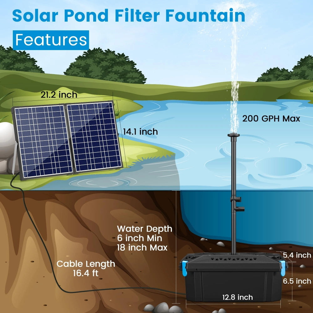 - Eco-Friendly Solar Powered: Powered entirely by the sun, this pond filter fountain kit eliminates the need for electricity, saving you money while being environmentally friendly. Enjoy a beautiful water feature without adding to your energy bills